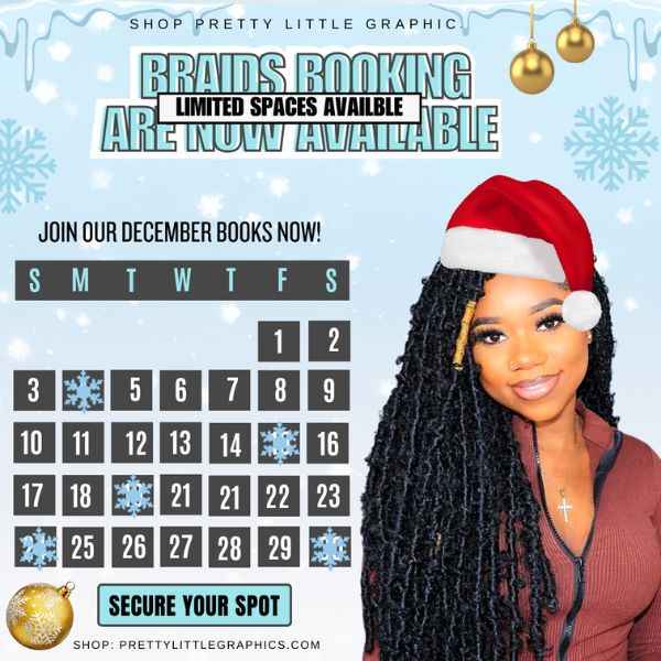 Step into a braid blizzard of holiday creativity with our DIY December Bookings Flyer is tailored for new and existing braids businesses. Our Canva DIY templates are designed to showcase your festive braid specials with style and ease. Elevate your braids business, spread the joy, and watch as your appointment calendar fills up with clients eager to embrace your expertise. Shop Now!